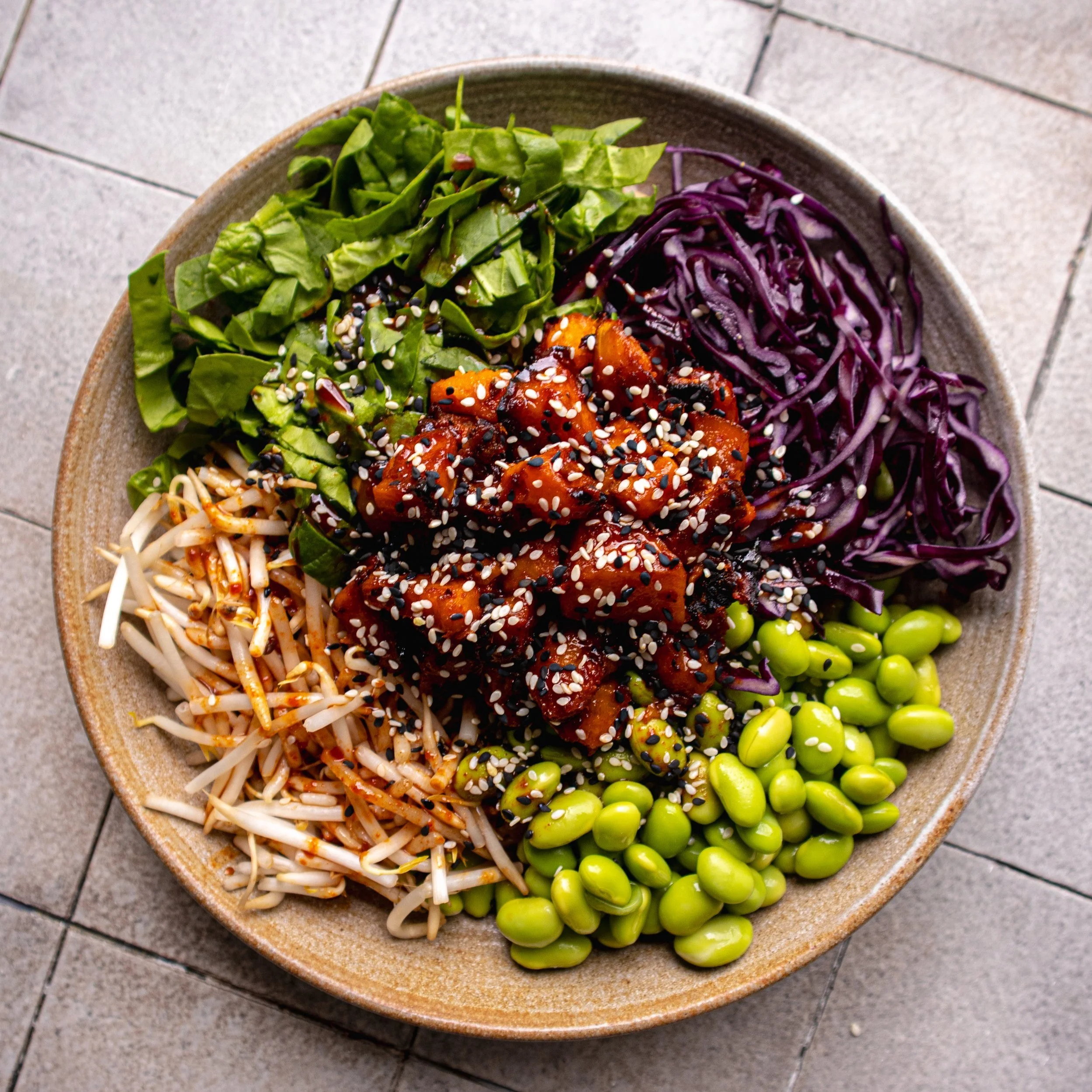 Craving something bold? This feel-good bowl delivers big flavour and plant-based protein, with wild rice, edamame, spinach, and bean sprouts packing in around 15g per serving. The real star? Gochujang! A tangy, spicy, slightly sweet Korean paste that brings deep, rich umami to every bite. Hearty, vibrant, and anything but boring.