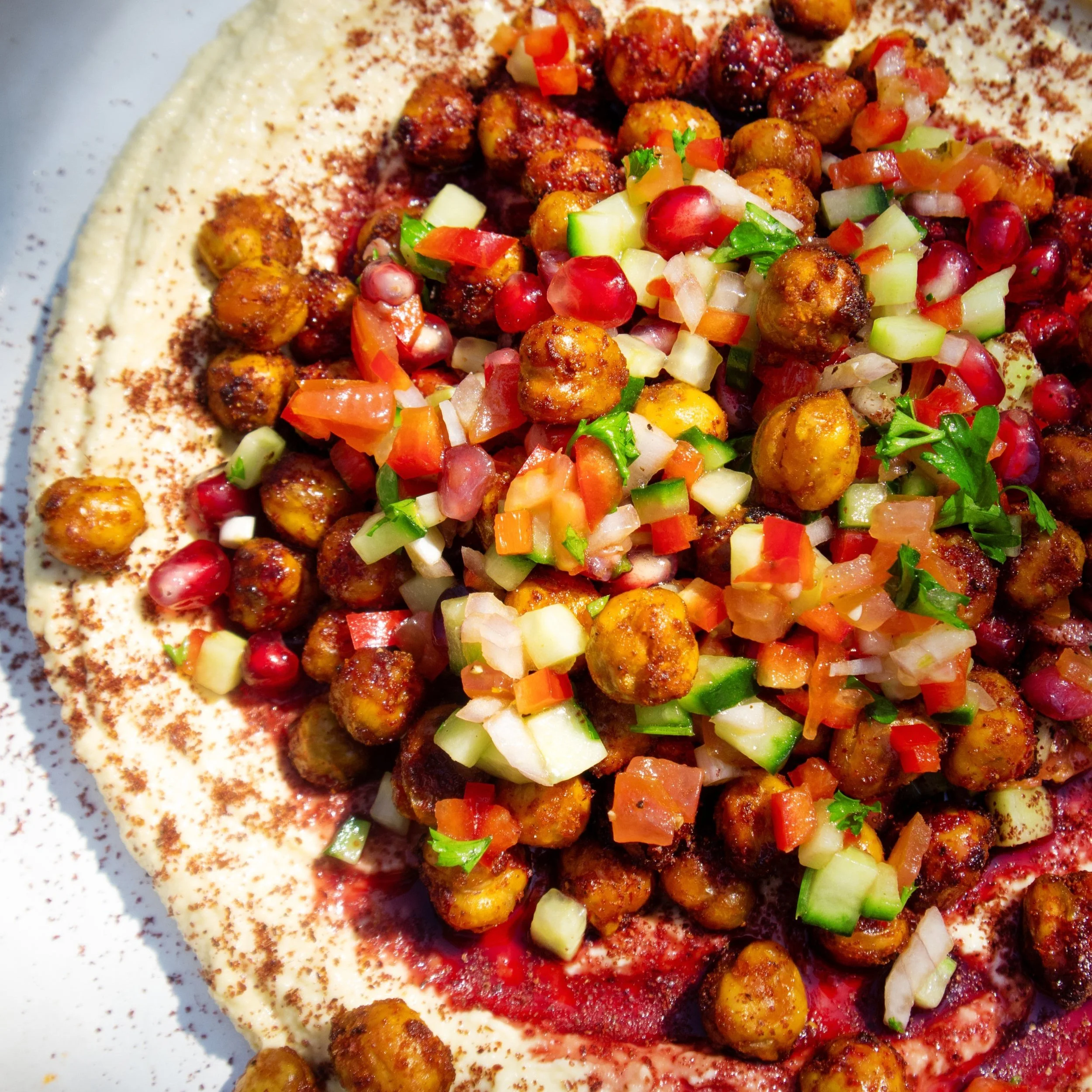 This is how you turn houmous into a meal. We roast chickpeas until they’re golden and crisp, toss together a vibrant chopped salad, and pile it all onto a generous bed of creamy houmous. Finished with a drizzle of pomegranate molasses, it’s sweet, crunchy, fresh — and proof that houmous isn’t just a dip. It’s dinner.