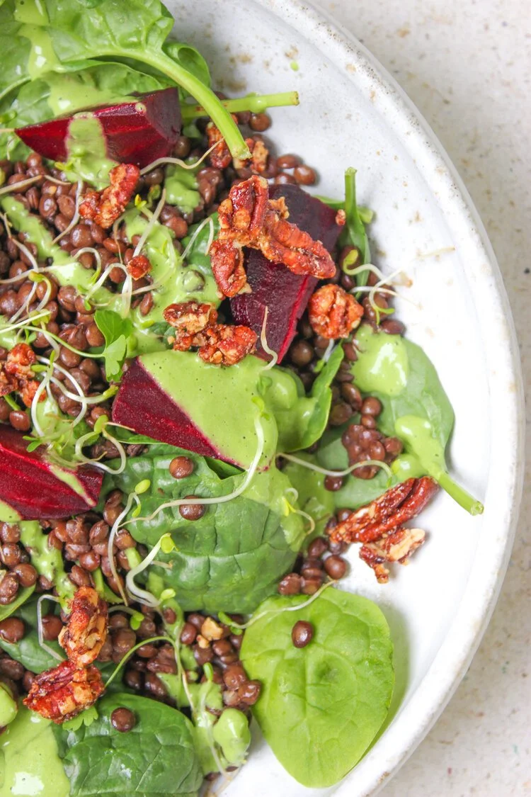 5. Wash the spinach and split between two bowls. Spoon over the lentils and beetroot. Roughly chop the pecans and sprinkle over. Finish with a generous drizzle of dressing.