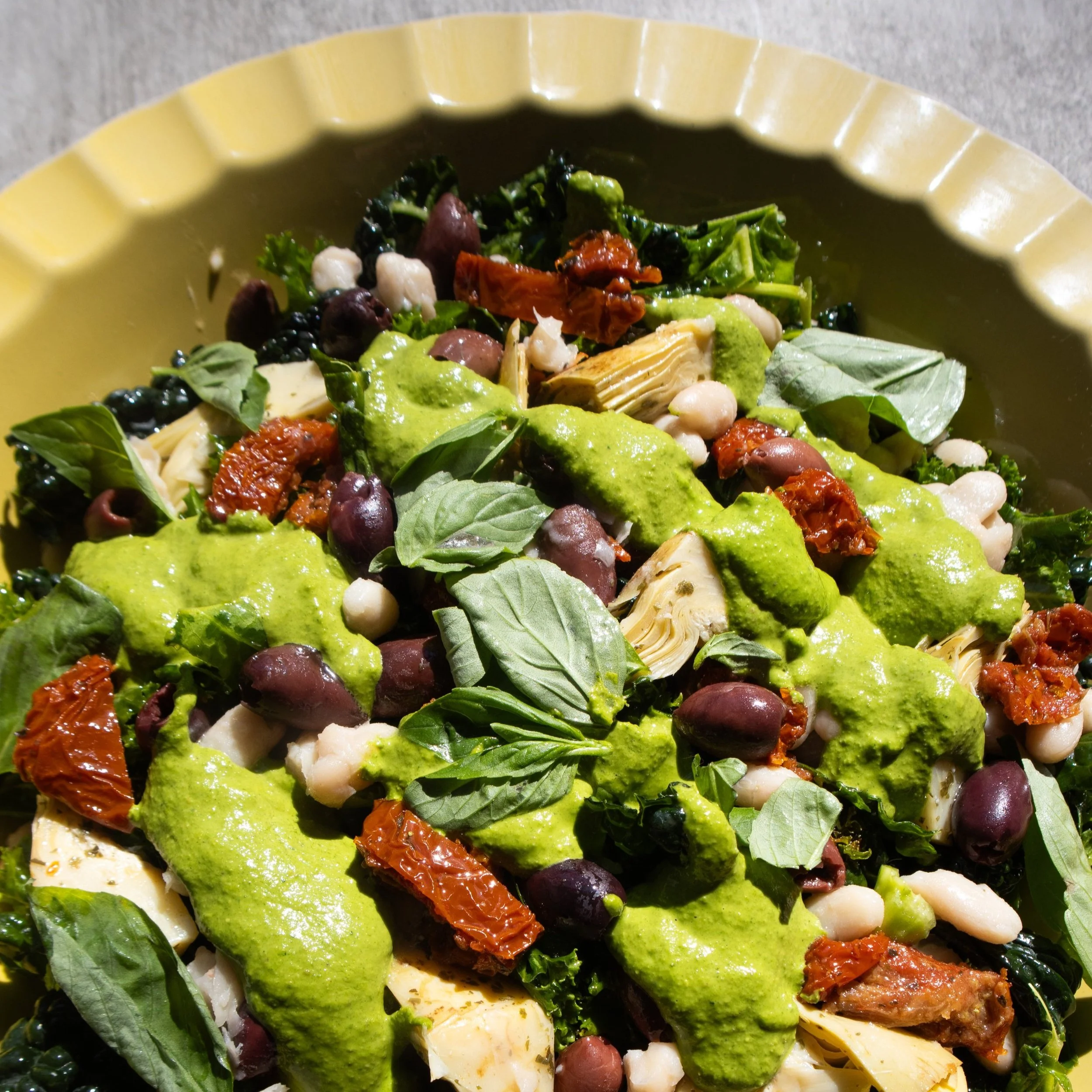 Our super green pesto is packed with protein, Vitamin C + E! Tossed with hearty white beans, marinated artichokes, sun-dried tomatoes, and briny olives, this Tuscan Pesto Power Bowl is a vibrant, nourishing dish that brings serious Mediterranean energy to your plate.