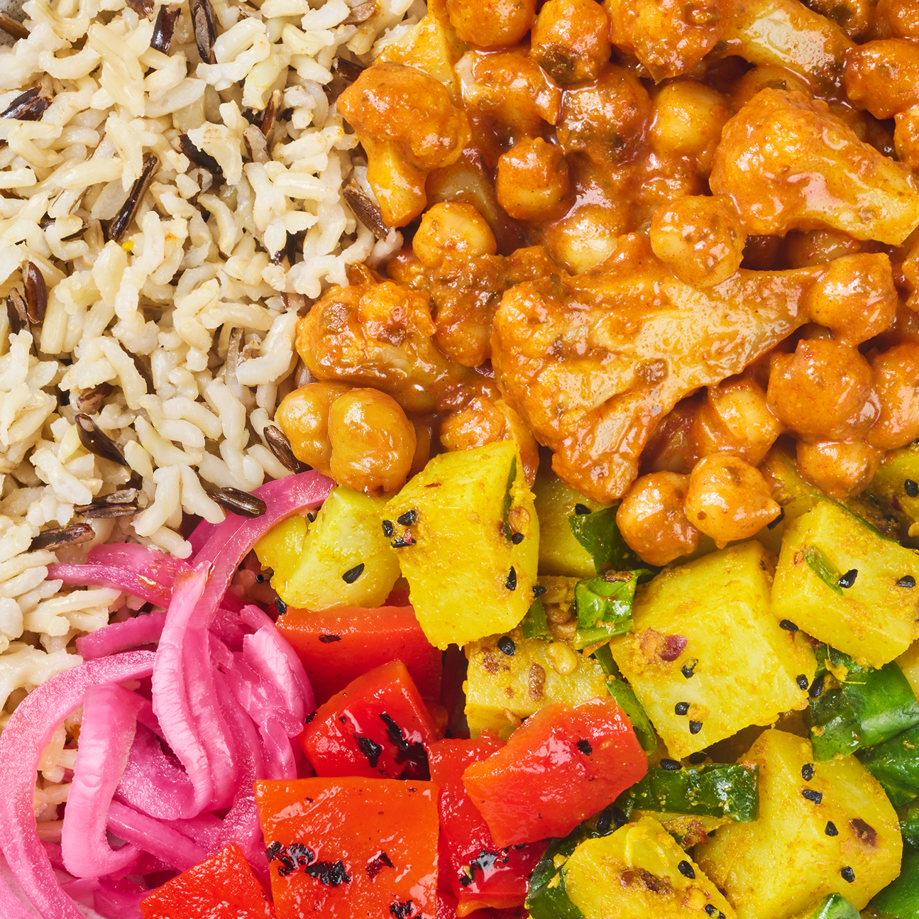 Indian inspired grain bowl with tikka chickpeas and cauliflower, saag aloo potatoes, brown and wild rice, grilled red pepper, sweet aubergine pickle and pink pickled onions.
